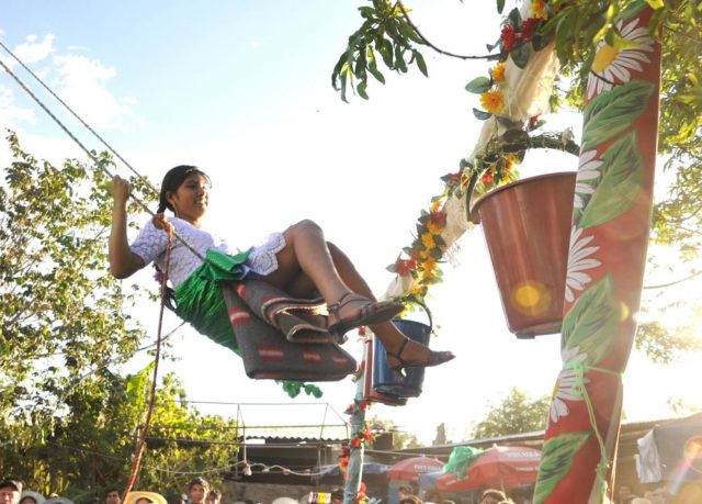 Es en los pueblitos alejados donde todavía se conserva esta tradición en su sencilla esencia. Nada de postes o listones de madera, sino las robustas ramas de venerables ceibos, molles u otros árboles representativos de donde cuelgan columpios hechos con sogas de cuero rústico.