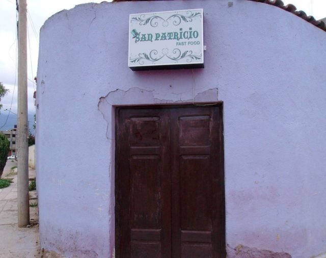 Hay anuncios que en todas sus intenciones de mostrarse originales o darse aires de sofisticación yerran por completo, sobre todo considerando el entorno o contexto. Suena más lógico que un local sencillo de un barrio alejado lleve un cartel de “pollos Doña Juana” o algo similar. Lo de “fast food” y otros apelativos de alienante moda es cosa de ambientes donde se asientan los malls o patios de comida con luces de neón. Pero de todas maneras, no se puede negar que a veces lo cutre tiene cierto encanto: esa ruinosa fachada lila y el cartel con filigranas de verde irlandés son de lo más surrealista que he visto en mis andanzas por la ciudad.