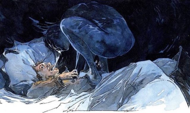 En el momento en que el marinero miró hacia el interior del cuarto, el gigantesco animal había aferrado a madame L’Espanaye por el cabello (que la dama tenía suelto, como si se hubiera estado peinando) y agitaba la navaja cerca de su cara imitando los movimientos de un barbero. La hija yacía postrada e inmóvil, víctima de un desmayo.