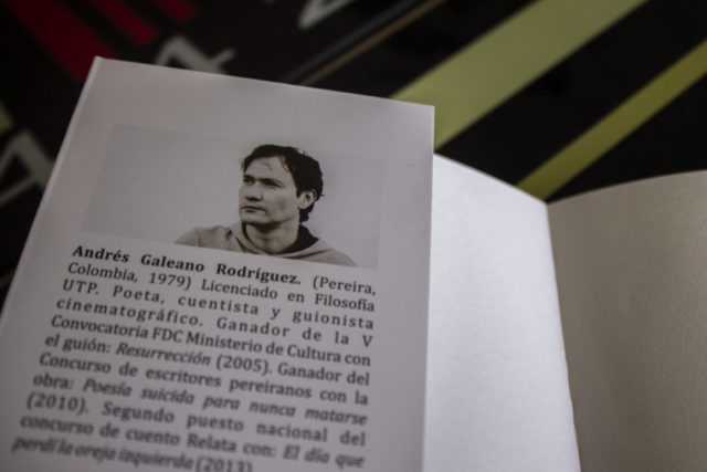 Quien define así su poesía es Andrés Galeano. Un joven poeta que ha sido ganador en dos ocasiones del Concurso de escritores pereiranos (Categoría poesía) con sus obras Poesía suicida para nunca matarse (2010) y De lo que soy (2017).